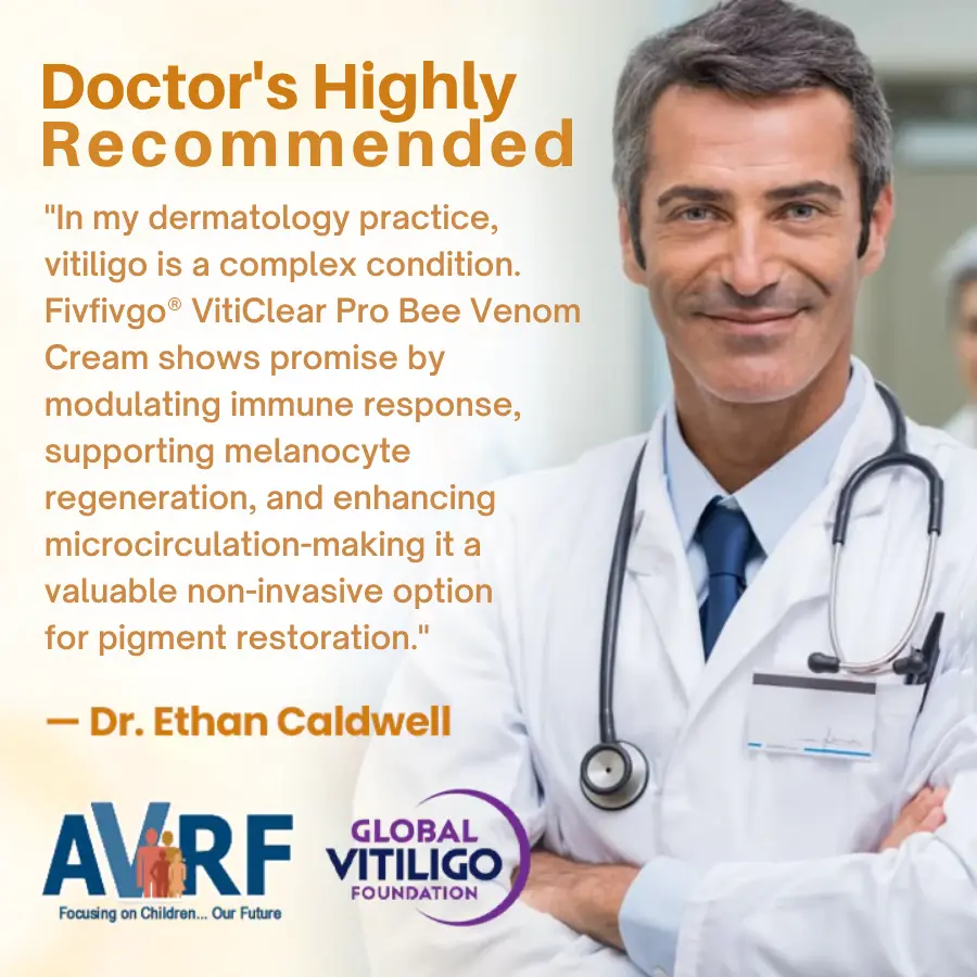 “In my dermatology practice, vitiligo remains one of the most emotionally and physiologically complex skin conditions. The formulation of Fivfivgo® VitiClear Pro Bee Venom Cream is promising due to it’s multifaceted approach—modulating immune responses via PLA2, promoting melanocyte regeneration, and improving skin microcirculation. I believe it offers a valuable adjunct for patients seeking non-invasive, supportive care for pigment restoration.”——Dr. Ethan Caldwell
