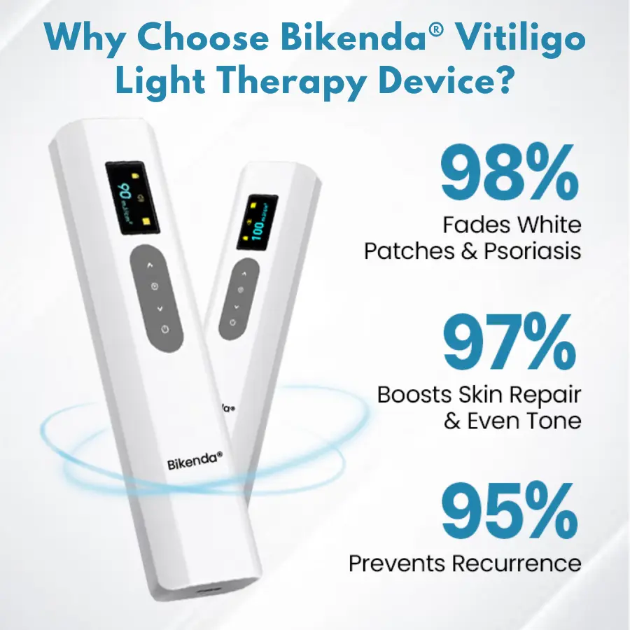 Unlike traditional treatments that require frequent clinic visits and long recovery times, Bikenda® Vitiligo Light Therapy Device requires only a few minutes daily — with visible improvements in just weeks. Whether you’re looking to restore skin tone or manage recurring vitiligo symptoms, it offers a simple, effective, and affordable clinical solution at home.